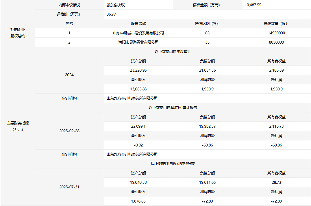 海陽市昊瀚置業(yè)有限公司35%股權(quán)及10487.55萬元債權(quán)
