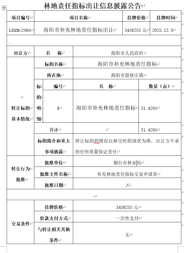 煙臺市蓬萊區(qū)林地責任指標出讓