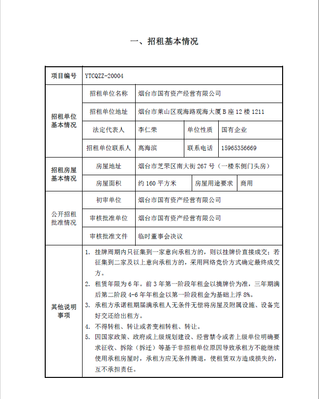 煙臺(tái)市南大街267號(hào)一樓東側(cè)門頭房招租公告