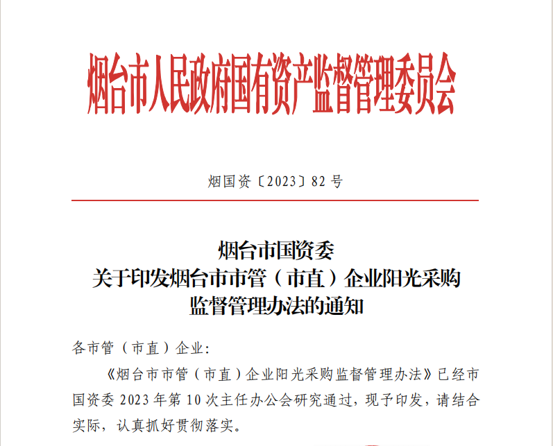 2024年6月30日,煙臺市國資委正式發(fā)布《煙臺市市管(市直)企業(yè)陽光采購監(jiān)督管理辦法》(以下簡稱:《管理辦法》),對進(jìn)一步加強(qiáng)國有企業(yè)陽光采購工作作出部署安排。